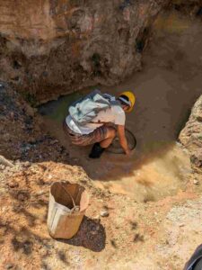 黄色いヘルメットと長靴を着用し、実際の採掘場へ。赤土の大地を掘り下げた場所に水がたまり、その中でふるいを使って石を探していきます。泥水の中からキラリと輝く水晶が顔を出したときの喜びは格別でした。
