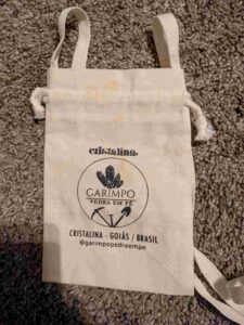 採掘体験のあとは、布製の記念バッグに石を入れて持ち帰ることができます。「Cristalina – Goiás / Brasil」のロゴ入りで、旅の思い出としてもぴったりです。