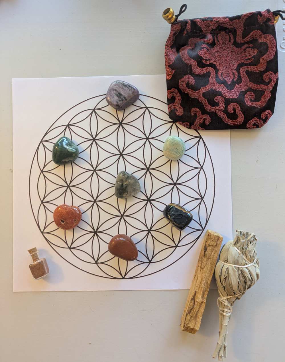 この模様の上にクリスタルを配置することで、それぞれの石が持つエネルギーを全体に共鳴・拡大させることができます。